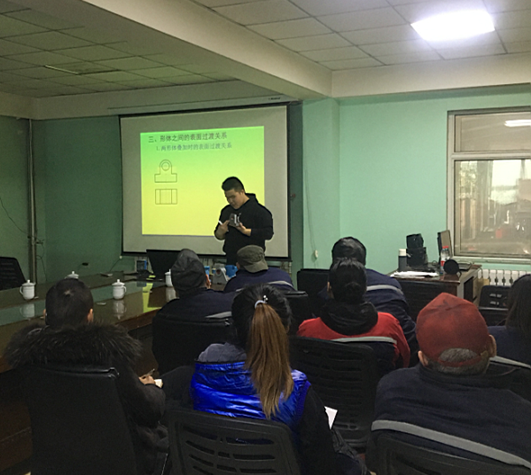 在实习期间,2017级机械设计制造及其自动化专业马志涛同学应企业邀请,参与蒙拓企业在生产系统内开展“培育工匠精神·争做技术能手”主题教育实践活动。针对企业部分岗位操作员看不懂机械加工图纸的实际现状,对生产部、品管安检部人员进行了为期一天的机械制图课程的培训。培训内容包括三视图、基本体的表面交线、相贯线、组合体三视图画法、标注尺寸、剖视图、零件图、装配图等相关知识。企业职工与马志涛同学进行现场互动,相互学习了理论及实践知识,得到了企业专家的鼓励与认可。
